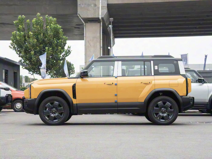再来看车身侧面部分,新车4545mm车长与2783mm轴距形成短悬长轴比例,1950mm车宽搭配21英寸轮毂实现3.6:1轮轴比。侧窗采用无框设计,黑色轮眉与侧裙导流槽强化越野属性,悬浮式车顶降低视觉重心。隐藏式门把手与航空铝车顶行李架形成功能与美学的平衡,1600kg拖挂资质满足户外拓展需求。实测后排腿部空间达980mm,头部空间接近1m,优于同级哈弗大狗。